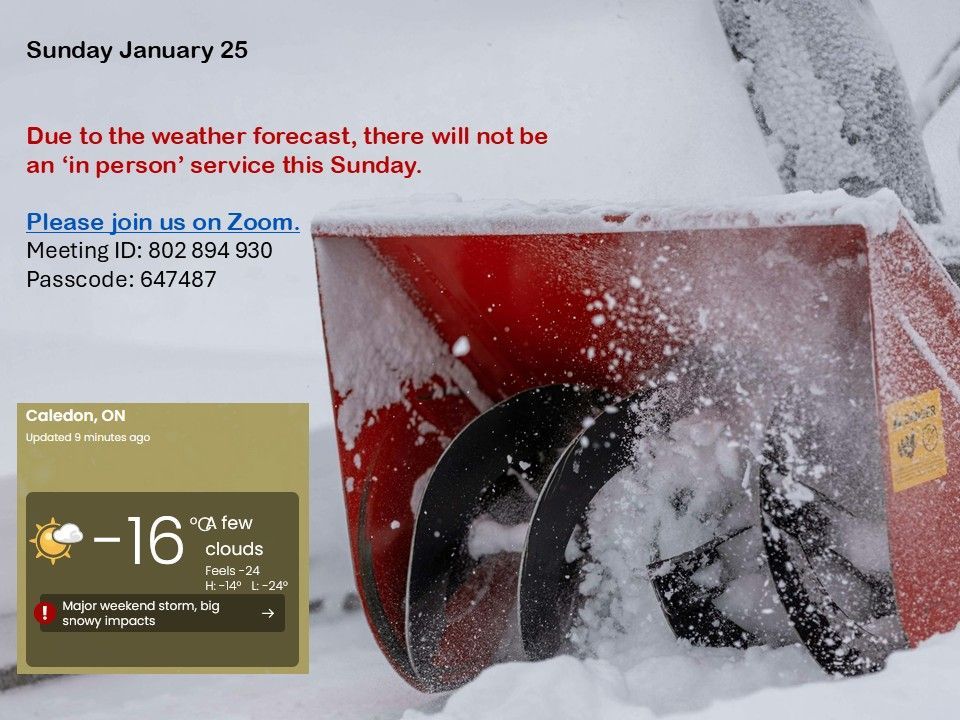 Due to the major snow/blowing snow forecast, there will not be an 'in person' service this Sunday, January 25, 2026. Please join us on Zoom (link below).