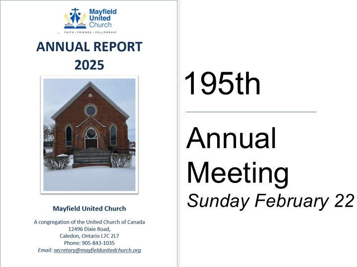 Refreshments will be served at the meeting, we also have a time of worship, prayer and dedication planned before and after the meeting. We do agree that it is paramount that we dedicate this meeting and all church endeavours to the power of our Heavenly Father. We gather to worship God here at Mayfield and pray for his blessing upon this church and faith community. We are grateful for our church and the relationships we have here, and our prayer is that we grow in faith, friends and fellowship again each year.